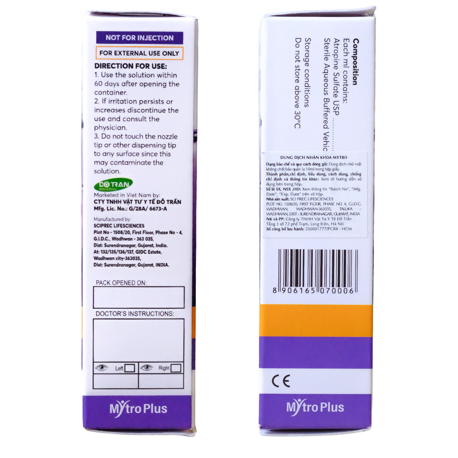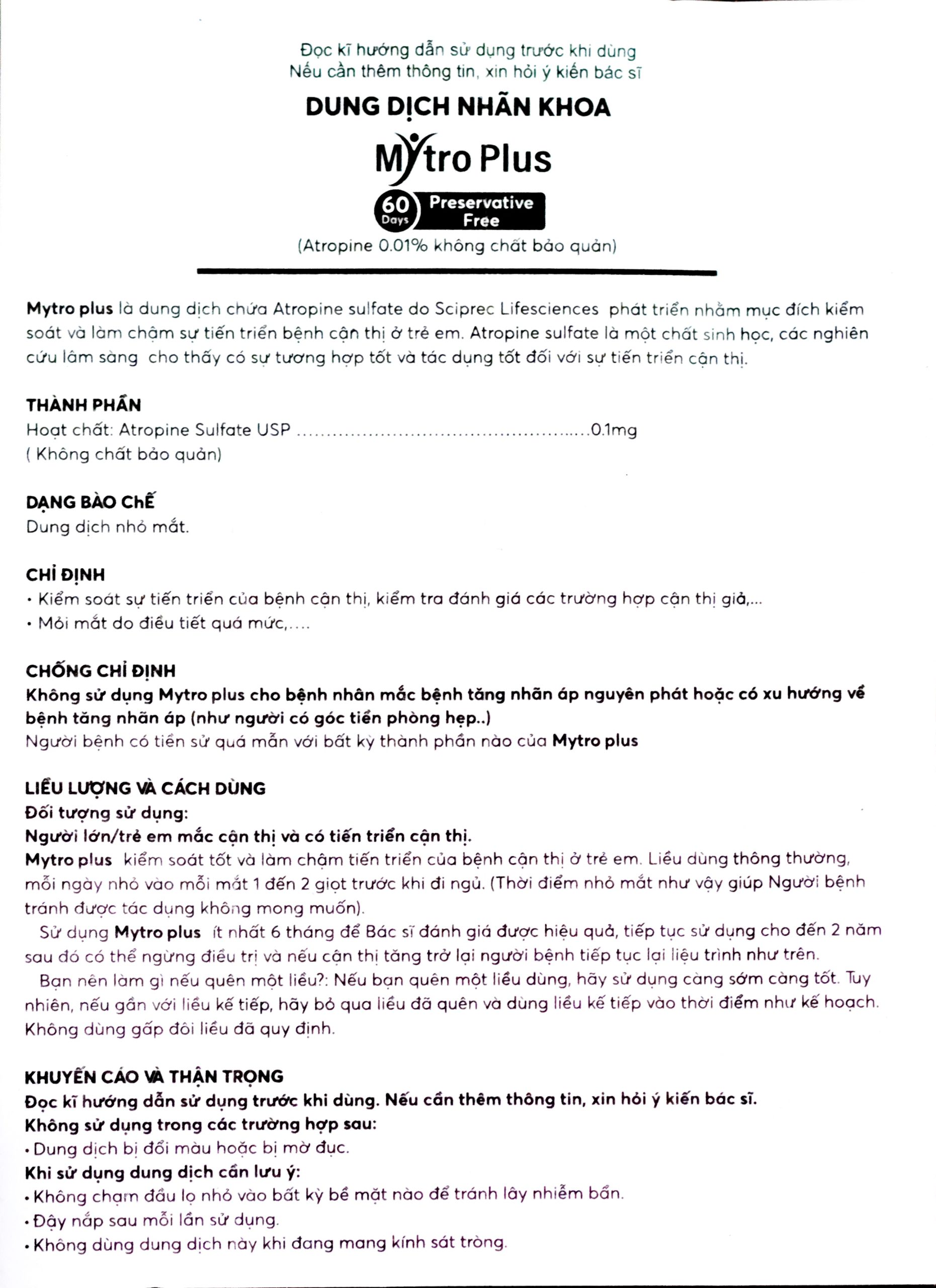 Mytro Plus là dung dịch nhãn khoa chứa Atropine Sulfate với các nồng độ 0.01%, 0.025% và 0.05%, được sử dụng trong kiểm soát cận thị học đường.