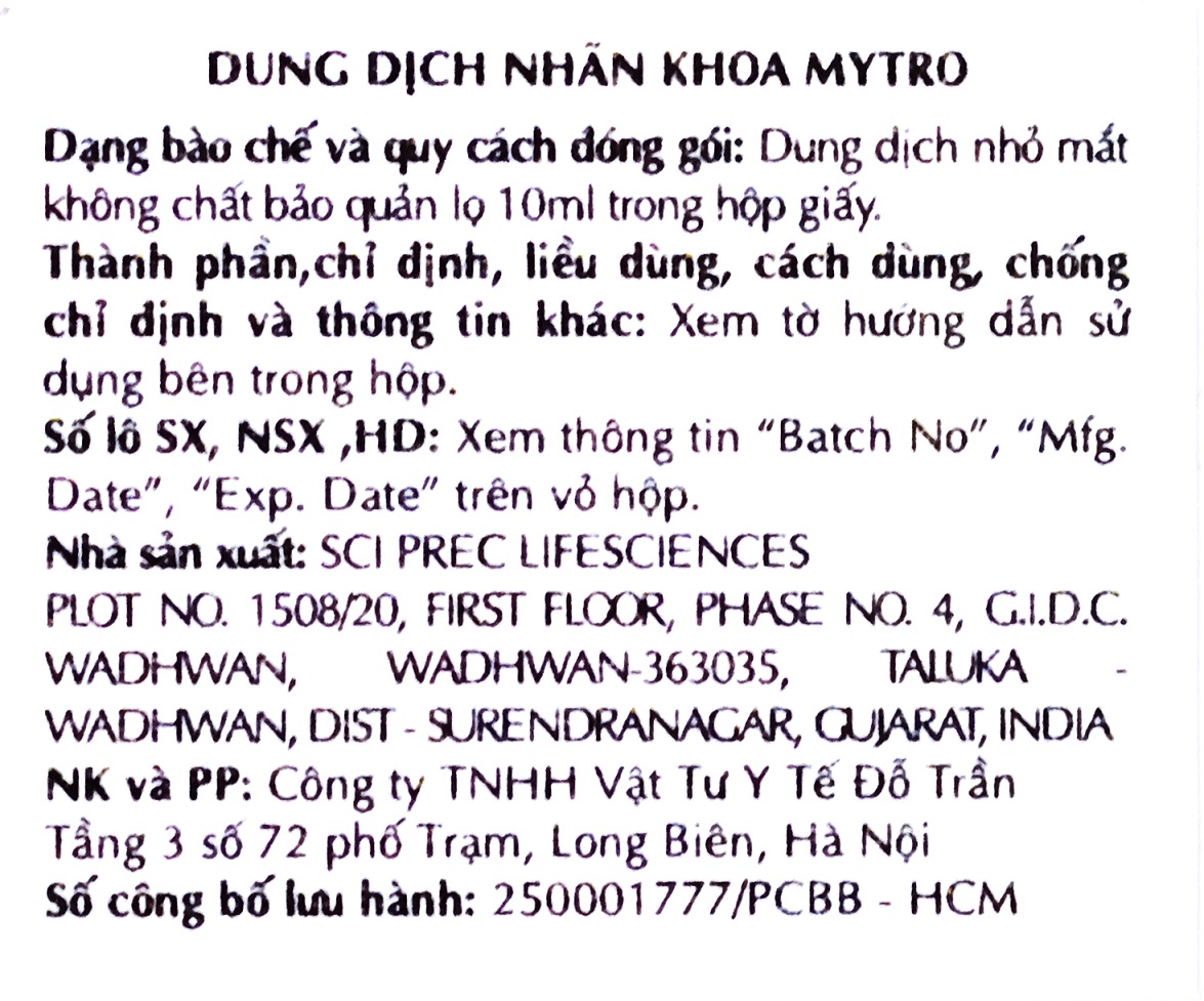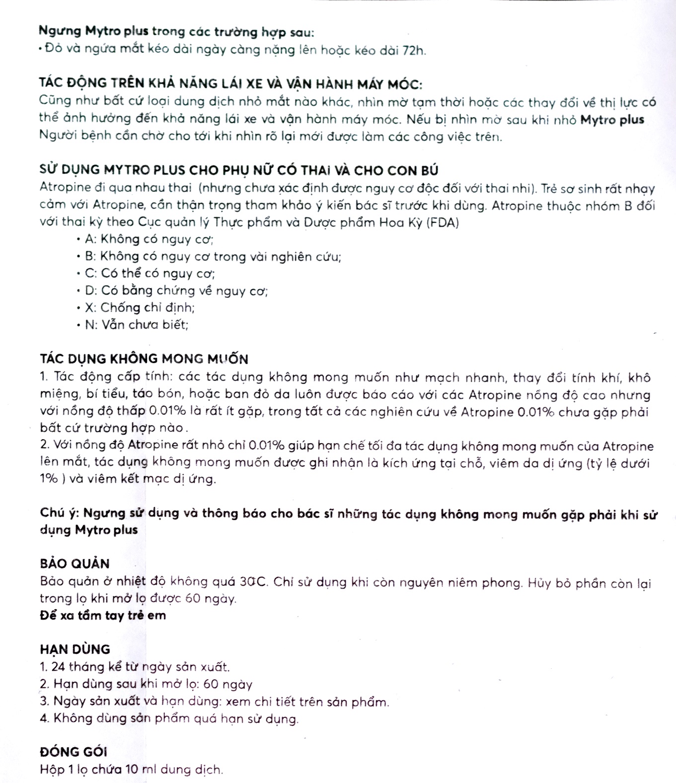 | Mytro Plus 0.01% | Atropine Sulfate 0.01% | Không chất bảo quản |