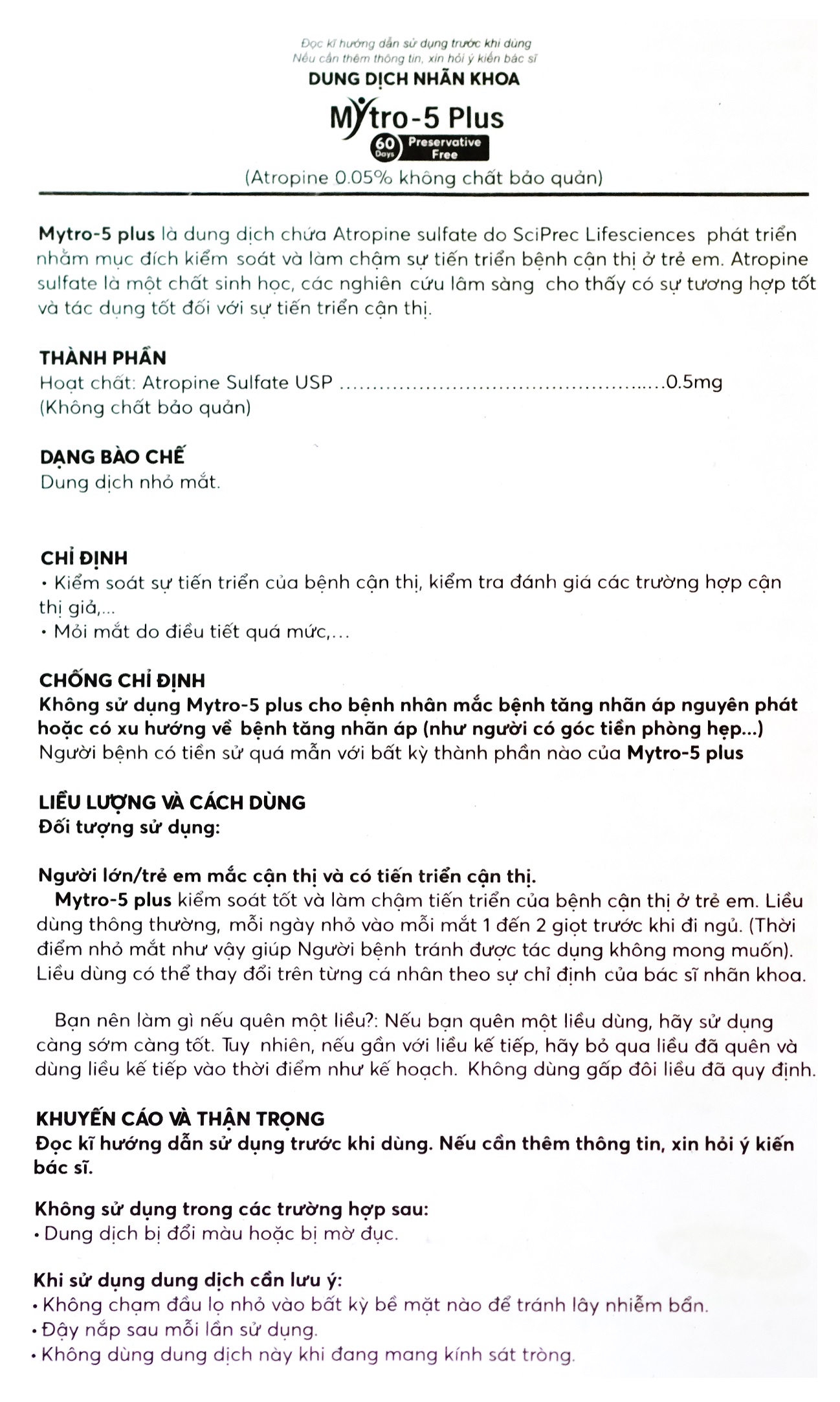| Mytro Plus 0.05% | Atropine Sulfate 0.05% | Không chất bảo quản |