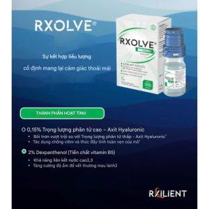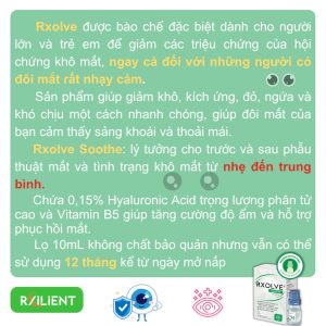 - RXOLVE Soothe: khô mắt nhẹ–trung bình, Natri Hyaluronat 0.15% + Dexpanthenol 2%.
