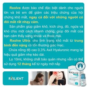 - RXOLVE Ultra: khô mắt trung bình–nặng, Natri Hyaluronat 0.3%.